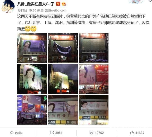 徐若瑄复出艰难重重,遭到全民族抵押,网友们纷纷抵制用自然堂的产品,自然堂知道其中的厉害,并通知各地把广告在迅速被撤,全部换成了赵丽颖的宣传广告,而且代言的广告也都下架了,连在大陆唯一广告代言都没有了。↓