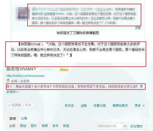 是在2010年,她做了一件侮辱全民族的事情,次日,徐若瑄在记者会上哭诉无法走红毯,把日本比喻成自己的养母,称“日本对我而言就如同是养母般的存在呢!引起全民族愤怒”。↓