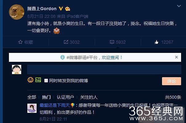 当然,事实肯定不是如此,第一个送上祝福的是导演陈嘉上,竟然提前了马天宇整整10多个小时就已经发博送上真挚祝福,能够把上下级同事关系相处到这个份上的,也只有脾气好颜值高还很贴心的郑爽了吧!