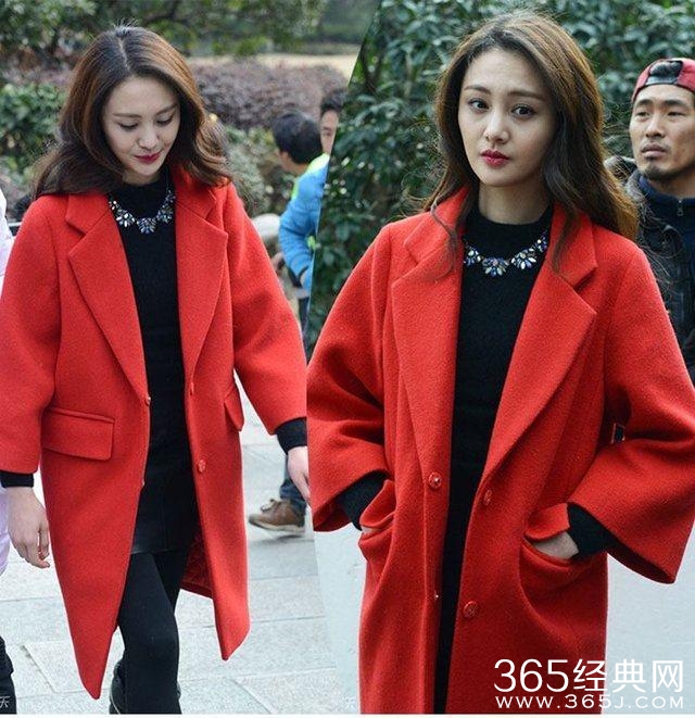 先来看看郑爽穿上这件红色呢子大衣的效果,身材纤细,皮肤白皙,显得美丽,落落大方。