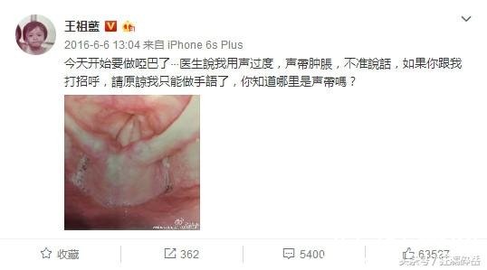 我们都知道王祖蓝发 让网友看到觉得恶心的配图不止一次了。今天开始要做啞巴了?医生說我用声过度,声帶肿脹,不准說話,如果你跟我打招呼,請原諒我只能做手語了,你知道哪里是声帶嗎?
