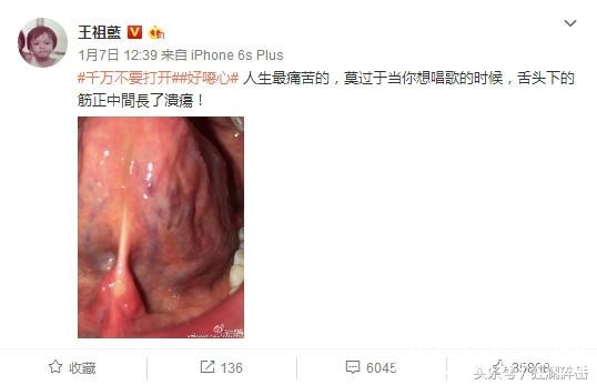 王祖蓝发的微博说,人生最痛苦的,莫过于当你想唱歌的时候,舌头下的筋正中间长了溃疡。并且还配有一张溃疡图片,看着真有点恶心。