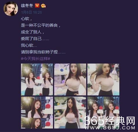 这是徐冬冬新近发布的照片,配文称:自己不是软柿子,不是你想捏就捏的。但是网友却只关注一个地方,你懂的——而且配文极具引导性。