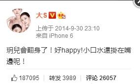 2014年9月30日,大S在微博晒出女儿小玥儿的照片,并配文:玥儿会翻身了!好happy!小口水还挂在嘴边呢! 这个时候,是她第一次用iphone 6发布微博。