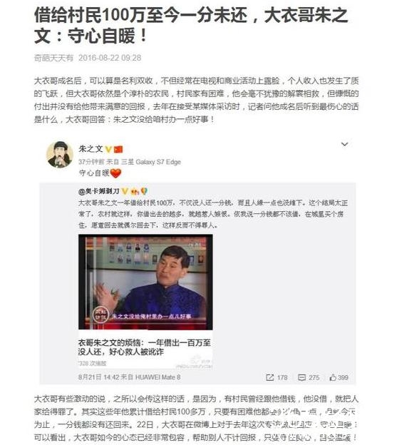 无独有偶,我们再来说说大衣哥朱之文吧。从《星光大道》出来的大衣哥朱子文同样遭遇了村民的“道德绑架”,朱之文一直都是农民,即使成名后也是一位地道的农民。当他登上春晚成为一个大名人时,他也把自己赚来的钱拿出来为家乡修路。结果家乡人却并不满意。因为家乡人觉得朱之文赚了很多钱,不应该那么小气,而是应该给老乡更多的好处,比如给老乡买车之类的。