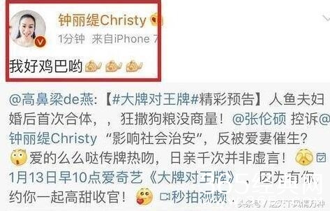 张硕伦总是说钟丽缇太性感,穿衣大胆;钟丽缇回复张硕伦到:你不喜欢吗?可见夫妻二人情趣生活甜蜜无比。