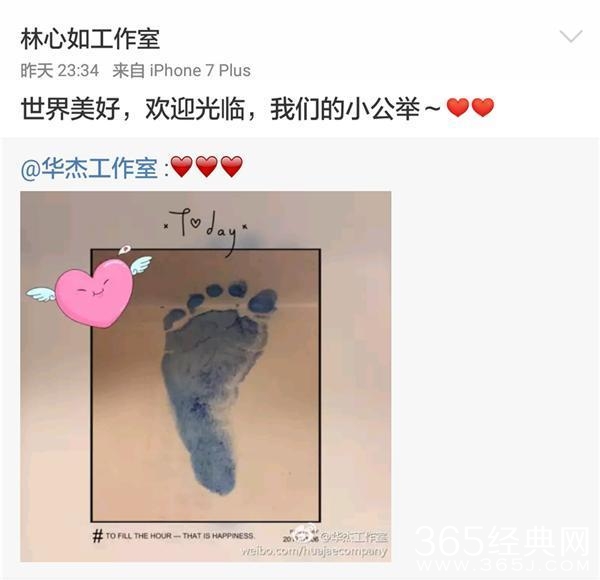 2017年1月6日晚,华杰工作室在微博上晒出了宝宝的脚丫照,林心如工作室发并配文“欢迎我们的小天使!”据悉,41岁的林心如当晚剖腹产下一个摩羯座宝宝,宝宝身长约50公分,体重约6.6斤。老干部霍建华也特别从北京飞去台湾陪产。