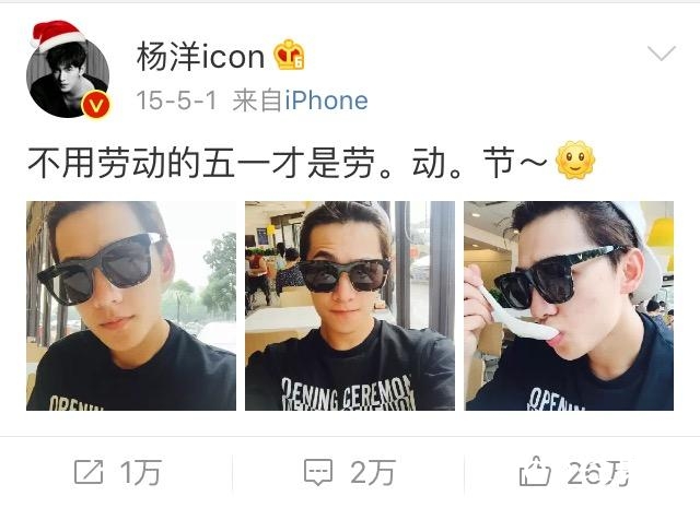 鲜肉还在长身体的阶段,吃不能停,吃不能停。杨洋的墨镜自拍就是隐藏着的进餐程序。三张图的潜台词就是:饭前浪---来了两碗粥---菜上齐了。