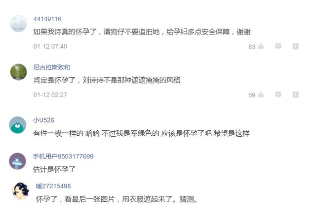 对此,网友纷纷猜测:“如果我诗真的怀孕了,请狗在不要追拍她,给孕妇多点安全保障,谢谢”,“肯定是怀孕了,诗诗不是那种遮遮掩掩的风格”,“有件和诗诗一模一样的衣服,应该是怀孕了吧”,“真的是不要盯太紧了,人家怀着宝宝呢”,“怀孕了,看最后一张图片,都用衣服遮起来了”!