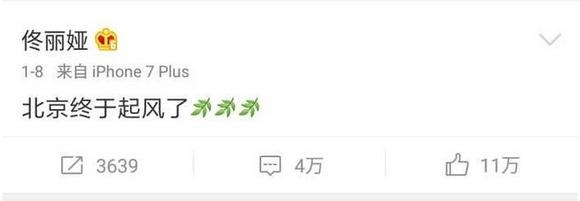 看到网友们评论丫丫微博:北京指的是北京爱情故事,意思是指爱情,终于指的是“还是来临”,起风了指的是无风不起浪,被打破,美好爱情童话被打破,一切还是来临了。丫丫不简单。