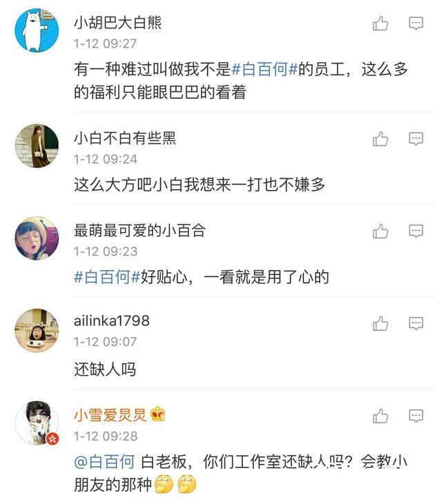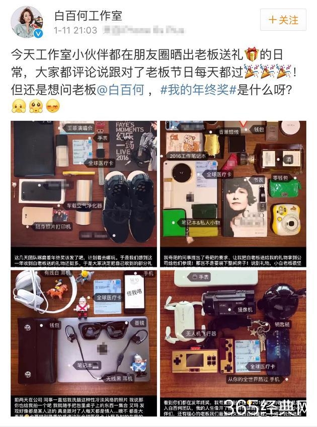 白百何工作室发布微博称:“工作室小伙伴都在朋友圈晒出老板送礼的日常,大家都评论说跟对了老板节日每天都过!但还是想问老板,今年我们的年终奖是什么呀?”在晒出的图片中,有最新款的手机、王菲演唱会门票、名牌包包和数码产品等,最抢眼的是全球通用的医疗保障卡。网友纷纷评论,“这样的老板太贴心,有一种难过叫我不是白百何的员工,请问工作室还缺人吗?”