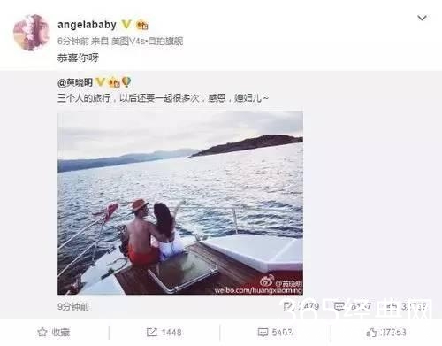 10月8日晚,黄晓明在微博po出一张与Angelababy的合影,配文“三个人的旅行,以后还要一起很多次,感恩,媳妇儿~”,首度承认baby怀孕的事实。