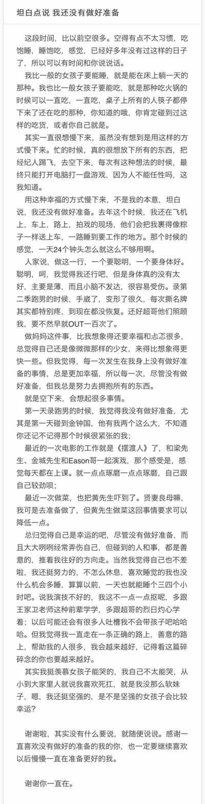 距离baby怀孕已经过了好几个月,日前也曝出了黄晓明陪baby赴台湾停工静静等待着宝贝的降临。快要当妈了baby也要充满了期待和未知的害怕,曾经发过微博坦言自己还没有做好做母亲的心理准备,说要和大家聊一聊。