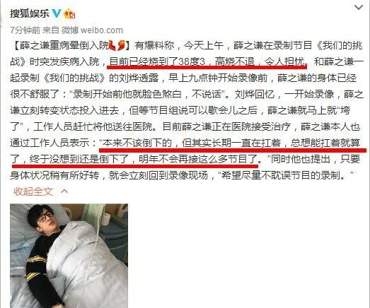 10日上午,谦谦在录制某综艺节目时突然病倒,被送入医院,曾一度高烧到38度3,持续难退,让人十分担心。和谦谦一同录制节目的刘烨曾透露,早上九点左右谦谦看起来已经非常难受了。刘烨说,只要一开始录制节目,谦谦能立马调整好状态,积极地投入进自己的角色。但只要节目组一说休息时,谦谦的身体立马就“瘫了”。