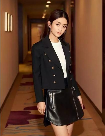 赵丽颖身穿双排扣的小西装,内搭白t恤,下搭黑色皮裙,显得十分干练,好一个霸道总裁,这样的赵丽颖简直帅呆了!