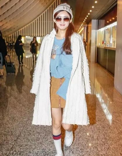 赵丽颖身穿白色大衣,内搭搭配浅蓝色毛衣,下搭卡其色短裙,脚踩小白鞋+条纹长筒袜,非常好看的色彩搭配,让人眼前一亮,头戴毛帽显得赵丽颖萌萌哒,(好 可爱)整个look看起来甜美可爱,十分时尚,不知道什么事笑的这么开心呢。
