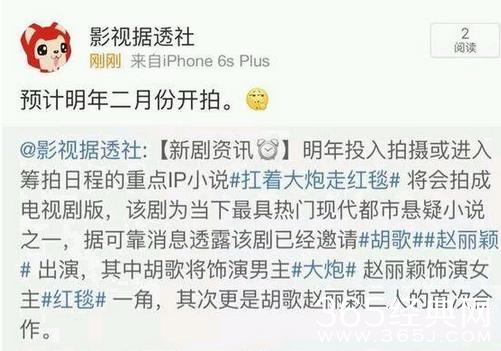 这不,最近有消息称,两人将会在明年一起合作一部ip新戏,《扛着大炮走红毯》(不要在意名字哈哈)。网友们似乎看到了胡歌脱单的希望,纷纷喊话赵丽颖:我胡的终身大事就看你啦!