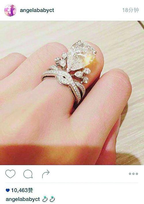 和黄教主黄晓明结婚的时候这大钻戒真的是闪亮啊,不过反过去看AngelaBaby的和张大大的合影,无名指的大钻石歪了,应该是大了一点,毕竟戒指都是越带越大