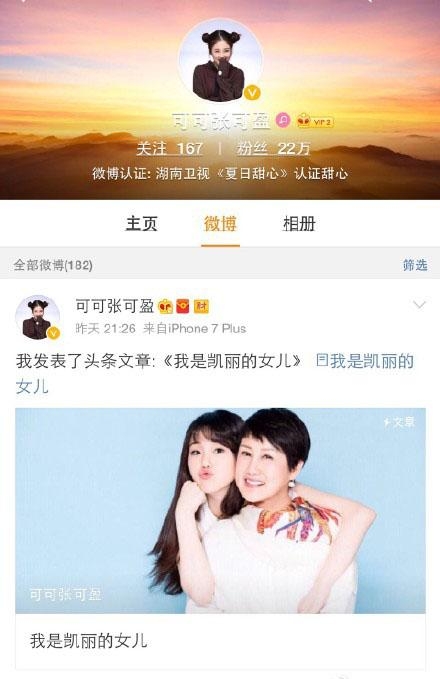 近日,张凯丽女儿张可盈发了一篇名为《我是凯丽的女儿》的微博,表示自己一直回避妈妈的光环,此次公开自己的身份,也是希望能在公开后更努力证明自己。张凯丽第一时间转发,并为女儿送上祝福。