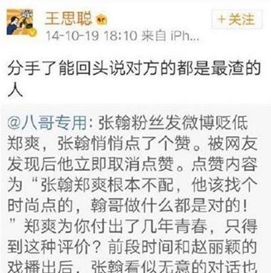 早年,张翰和郑爽分手之后,有网友在郑爽的微博里骂郑爽,而张翰还默默的点了赞,随后又悄悄取消,但还是被王思聪发现,并在微博里骂了张翰。