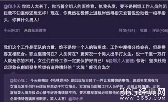 不过尽管孙俪力挺,但是对于印小天打击最大的是2012年爆出“印小天动粗”时间,这件事对于他的个人形象和人气都是打击非常的严重的。印小天在拍摄《枪林弹雨》时,被女演员边潇潇指控他打人,表示本来讲好的借机吻戏最后却要真吻,两人的矛盾一触即发。印小天也被大家攻击“耍大牌”!