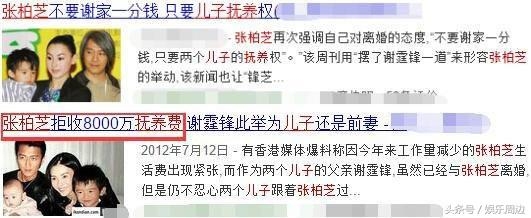 当年谢霆锋和张柏芝离婚之后,关于两个儿子抚养费的新闻就层出不穷,不少媒体报道“张柏芝只要两个孩子,而关于抚养费更是没要谢霆锋一分”。