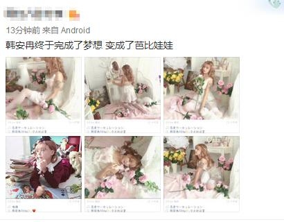 下面是韩安然最近的照,头发染了新的颜色打扮穿着也变了,看着还真是有芭比娃娃的风格,大家可以看下下面韩安然这中风格的照?是不是很芭比呢?