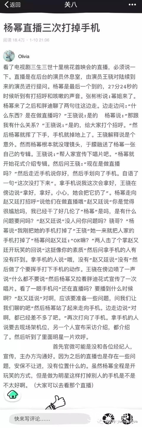 看来那天该官微运气不好,先是被杨幂打掉手机,后来进入发布会现场又受到阻挠。还可以听到直播的工作人员在抱怨:“到底什么情况!官微耶,开玩笑一样?”