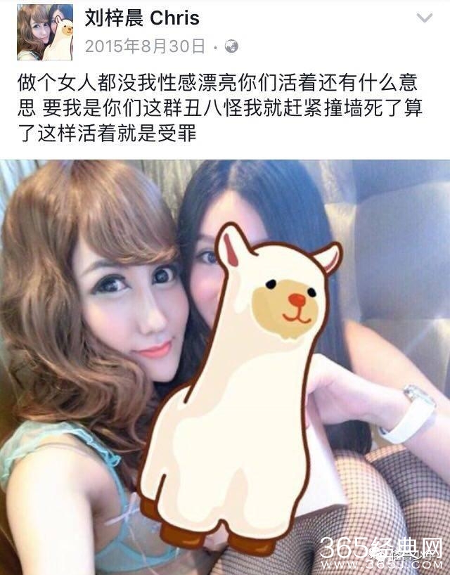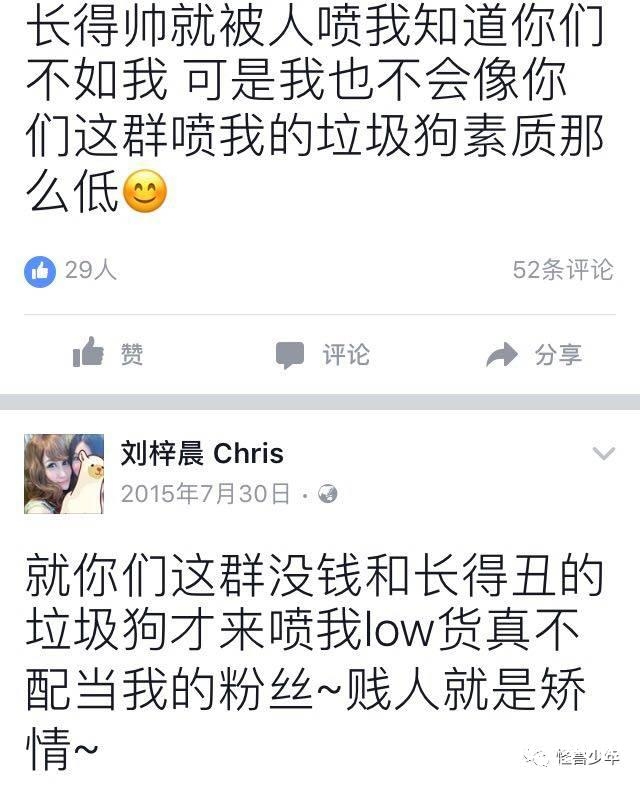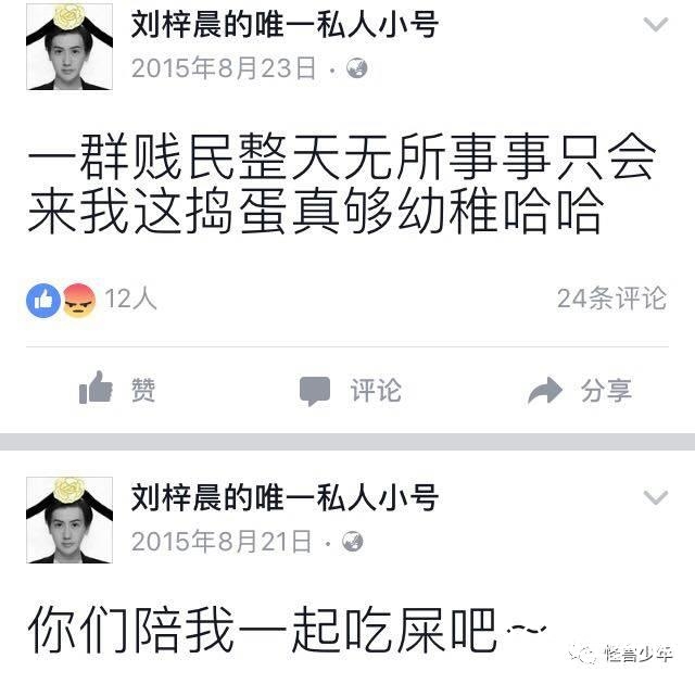 除了微博,刘梓晨还转战脸书。几个名字和他有关的ID都曾爆出惊人的言论。比如“刘梓晨的唯一私人小号”