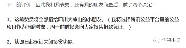 凤姐近日再发文,宣布将这笔钱全部捐给四川大凉山的小朋友,从此以后永远关闭赞赏功能。