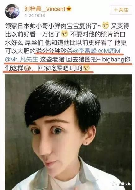 刚消停一会,他又开始向当红小鲜肉鹿晗、李易峰、吴亦凡等人开炮,除了高捧自己之外,还对其他艺人进行人身攻击,反正谁都不如他。