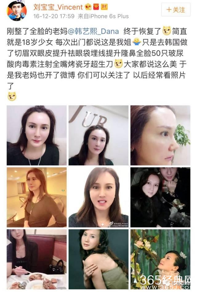 刘梓晨不仅自己整容,连他的妈妈也为整容事业略尽绵薄之力,在韩国打了50只玻尿酸,肉毒素全嘴烤瓷牙应有尽有。