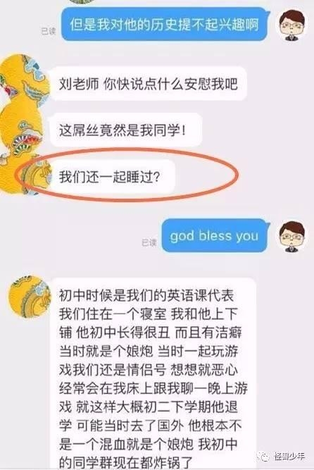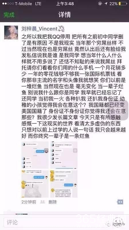 既然脸书没有认证,并非就是刘梓晨本人的言论。但是之前网上曝光疑似他成名后,老同学找他相认的聊天记录,可以看出这番言论和脸书上的如出一辙,也是张口闭口的穷B傻X。
