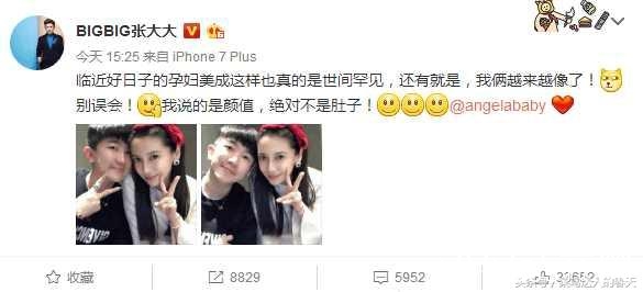照片中的baby和张大大都微笑着比划着剪刀手,特别是baby,头顶系上红色的蝴蝶结简直美翻了;