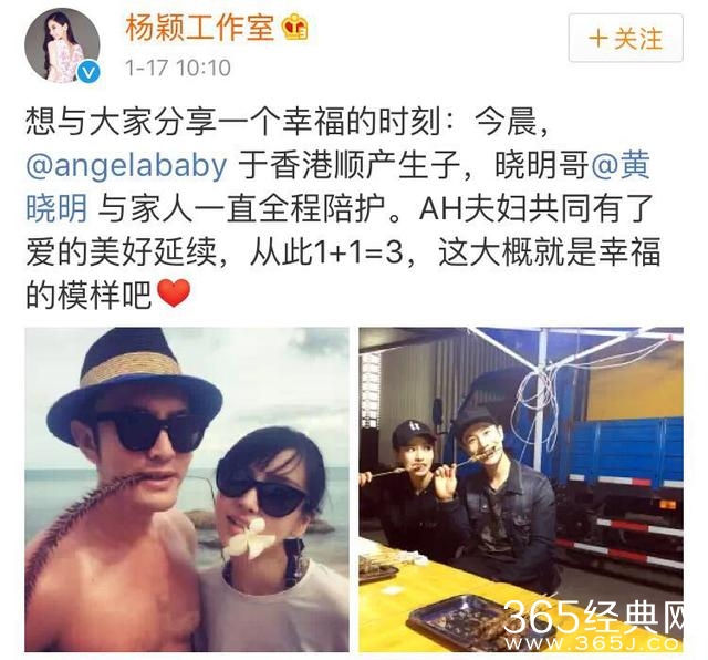 17晨,黄晓明工作室与杨颖工作室发布喜讯,宣布教主夫人Angelababy顺利产子!