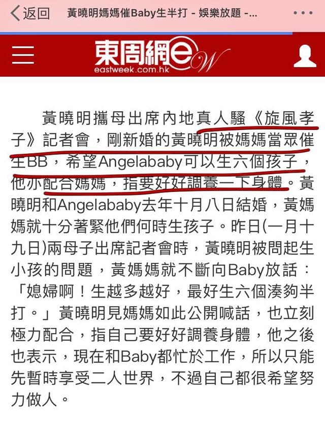 据媒体称,黄晓明妈妈曾在内地某次节目中称希望Baby生6个孩子,看来Baby要加油咯~