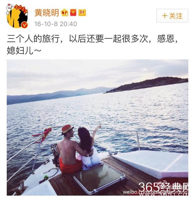 黄晓明与Angelababy从宣布怀孕喜讯到生子可谓神速。2016年10月8日晚,黄晓明在微博晒出一张与baby在游艇上的照片,并写道:“三个人的旅行,以后还要一起很多次,感恩,媳妇儿~”随后baby也转发了微博,并称“恭喜你呀。”