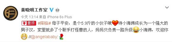 在17日下午,黄晓明通过个人微博分享了老婆Angelababy于当天在香港顺利产子的消息,他激动地表示:“小海绵降临!!!母子平安。”微博也第一时间晒出了和爱子的手部合影,黄晓明的大拳头与新生儿娇嫩的小拳头轻触在一起,父子二人完成了“两个男人”间的一次“对话”。
