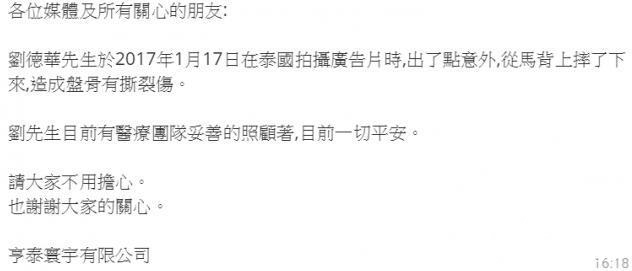 目前刘德华旗下的亨泰寰宇有限公司对受伤事件做出回应,原文如下:
