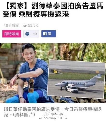 刘德华先生于2017年1月17日在泰国拍摄广告片时,出了点意外,从马背上摔了下来,造成盘骨有撕裂伤。