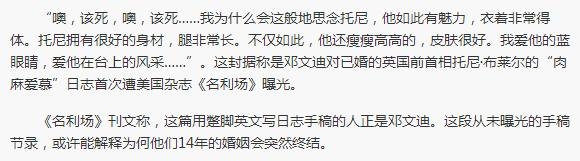 邓文迪与默多克离婚之后,感情世界比玛丽苏言情小说都精彩,还曾和普京大帝传过花边新闻。而默多克曾亲口承认他与邓文迪离婚的主因,是邓与前英国首相布莱尔之间的绯闻。