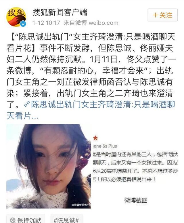 先是前天佟丽娅的父亲点赞了这么一条微博,称“要有颗忍耐的心”;接着“出轨门”的女主角刘芷微、齐琦先后跳出来,或发律师函表示“清者自清、”或称三人并没有发生不正当关系,说在总统套房待了一夜只是在“喝酒聊天看片花”……