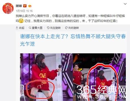 1月14日,《快乐大本营》播出谢娜模仿《西游记》中“猪八戒背媳妇”的经典情节,播出后,网友截图称谢娜走光。对此,谢娜在18日发微博回应道:“我辣么卖力开心滴做节目,你看这在胡说八道些啥呀,知道有一种短裤叫牛仔短裤吗?记住,我是实力派的,别搞这些有的没的,来,干了这杯82年的红酒!”