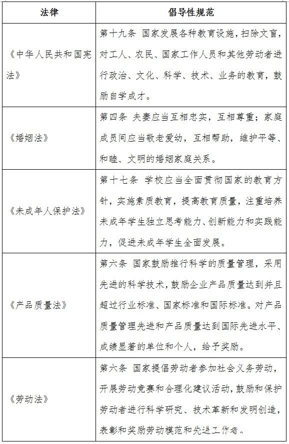 但作为一个倡导性规范,“常回家看看”虽然在司法实践中缺乏可操作性,用强制性条款逼迫人们尽孝亦不现实,但在法理学上,它体现了法律对道德的促进作用。而类似的倡导性规范在法律条文中并不少见:
