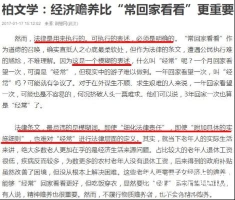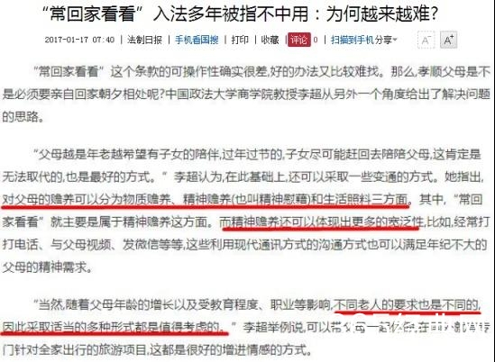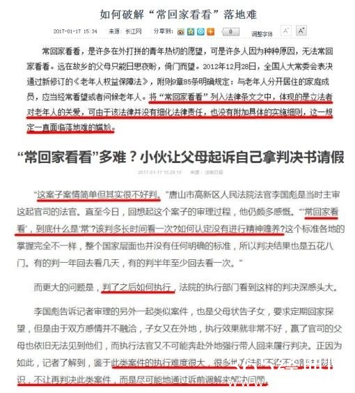不少媒体认为,“常回家看看”作为一条法律条款,没有细化法律责任,也没有附加实施细则,难怪落地困难。