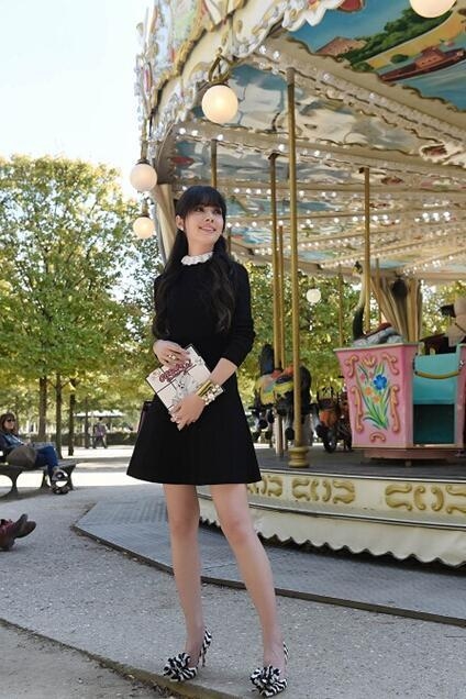 郭碧婷齐刘海配上卷发,穿上黑色连衣裙显得复古淑女,简直像漫画中的美少女