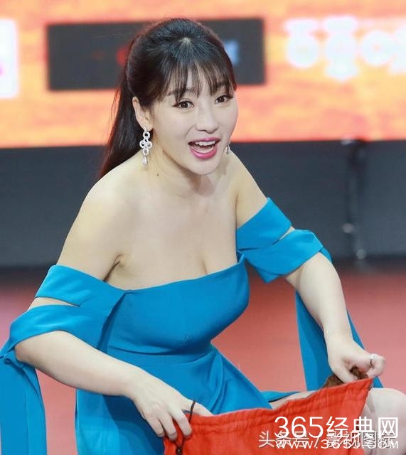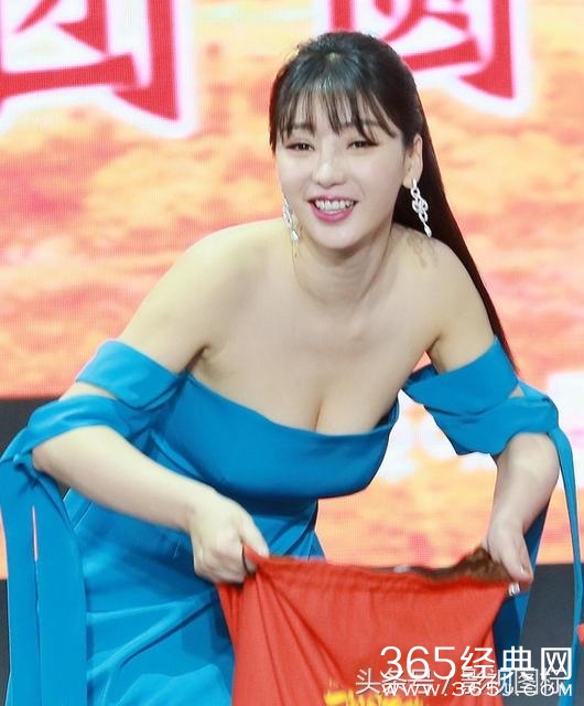 这就是传说中的柳岩蓝色一字肩抹胸长裙,尤其俯身的时候,柳岩可以大秀傲人美胸,大展好身材。