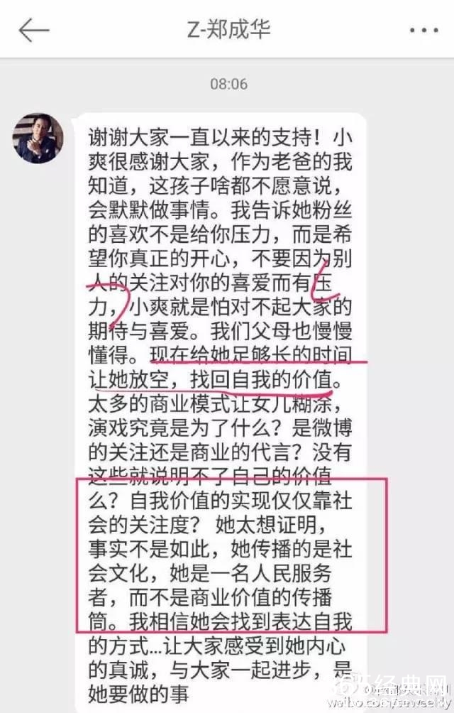 爽爸微博自动回复的私信写着,作为父亲他也意识到郑爽的压力之大,一直在开导她。爽爸的这个回复也暴露了郑爽现在很迷茫,压力挥之不去,