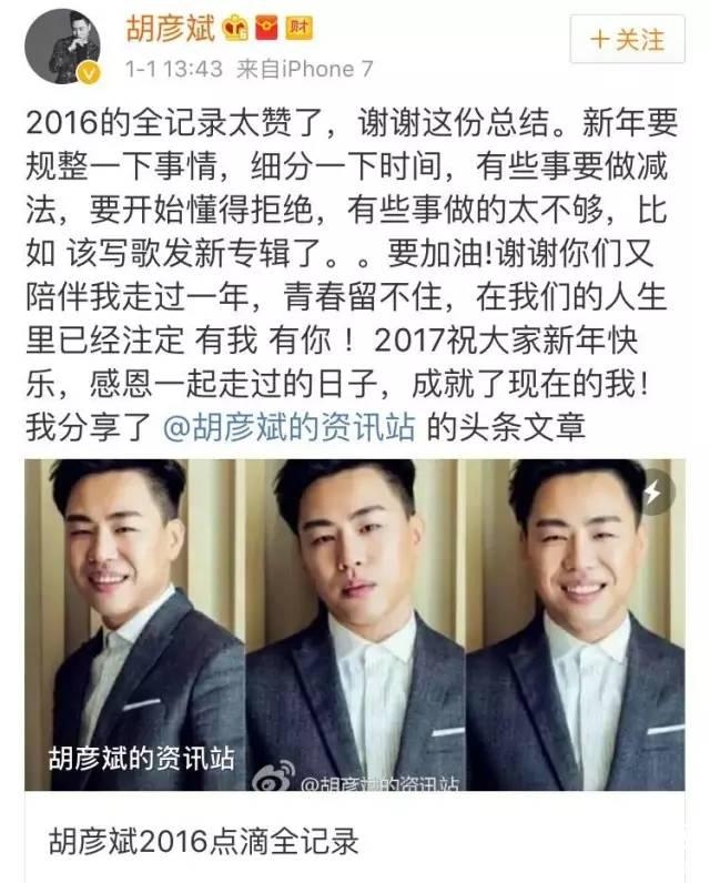一月一号胡彦斌转发了他的后援会整理的胡彦斌2016年的点滴记录,