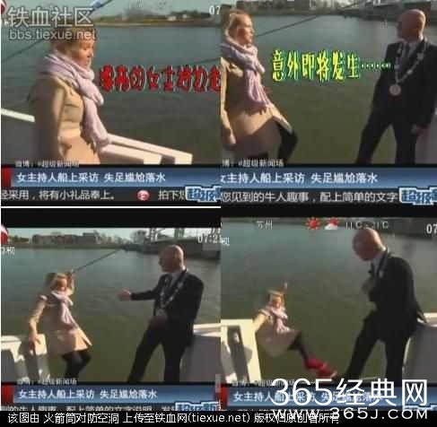 国外一主持人在船上采访,当她走向船长时,想摆一个漂亮的POSE,然而当她的手抓住缆绳时,悲剧发生了,噗通一下,她跌进了水里顿时尴尬不已。